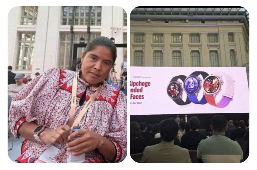 La atleta rarámuri Lorena Ramírez fue invitada como embajadora especial a la presentación internacional del nuevo reloj deportivo de Huawei en Madrid, España.