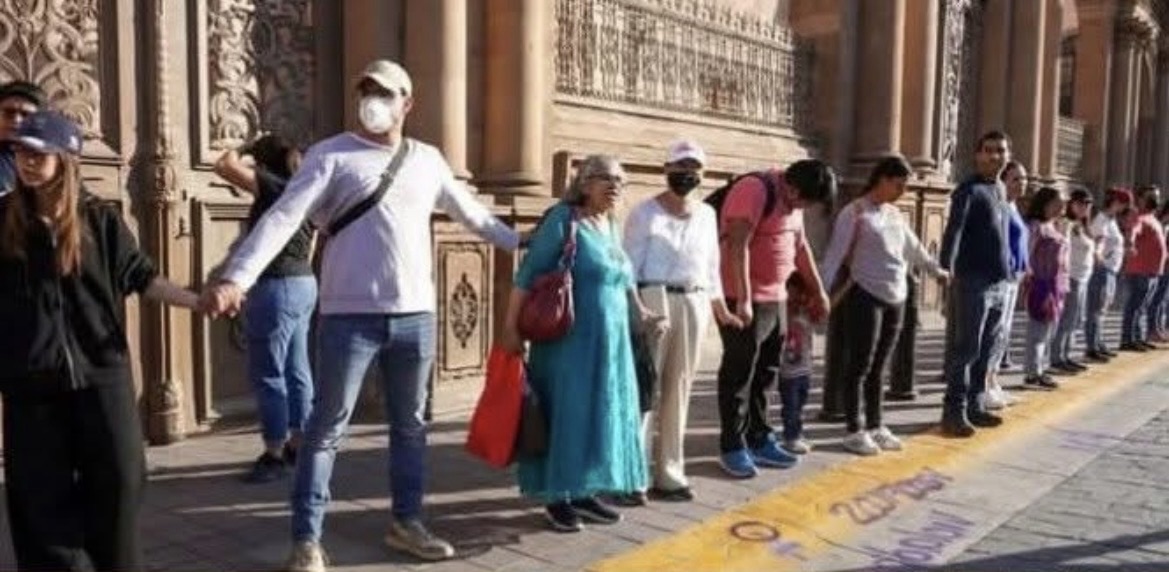 En videos que circulan en redes sociales se observa a varios ciudadanos colocarse alrededor del templo, tomados de las manos, mientras el contingente de manifestantes avanzaba por las calles del centro de la ciudad.