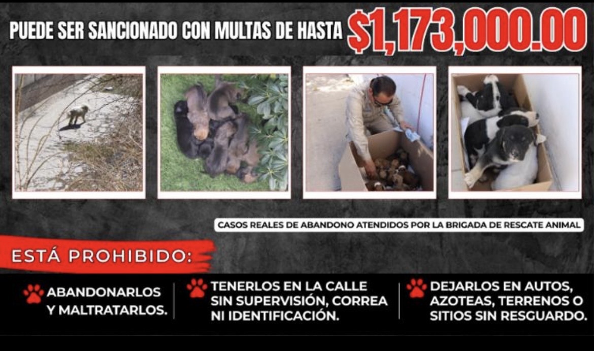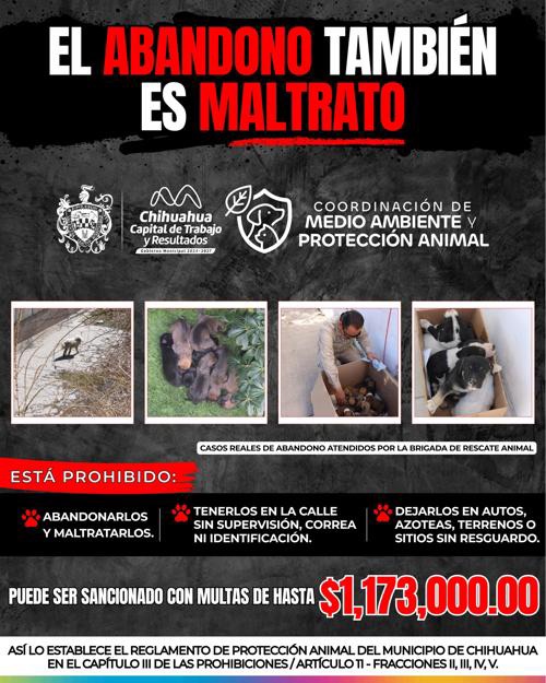 Advirtió con estos casos que “el abandono también es maltrato” y las multasascienden a un máximo de hasta $1,173,000, con base en la UMA de 2026, según el Reglamento de Protección Animal del Municipio de Chihuahua.